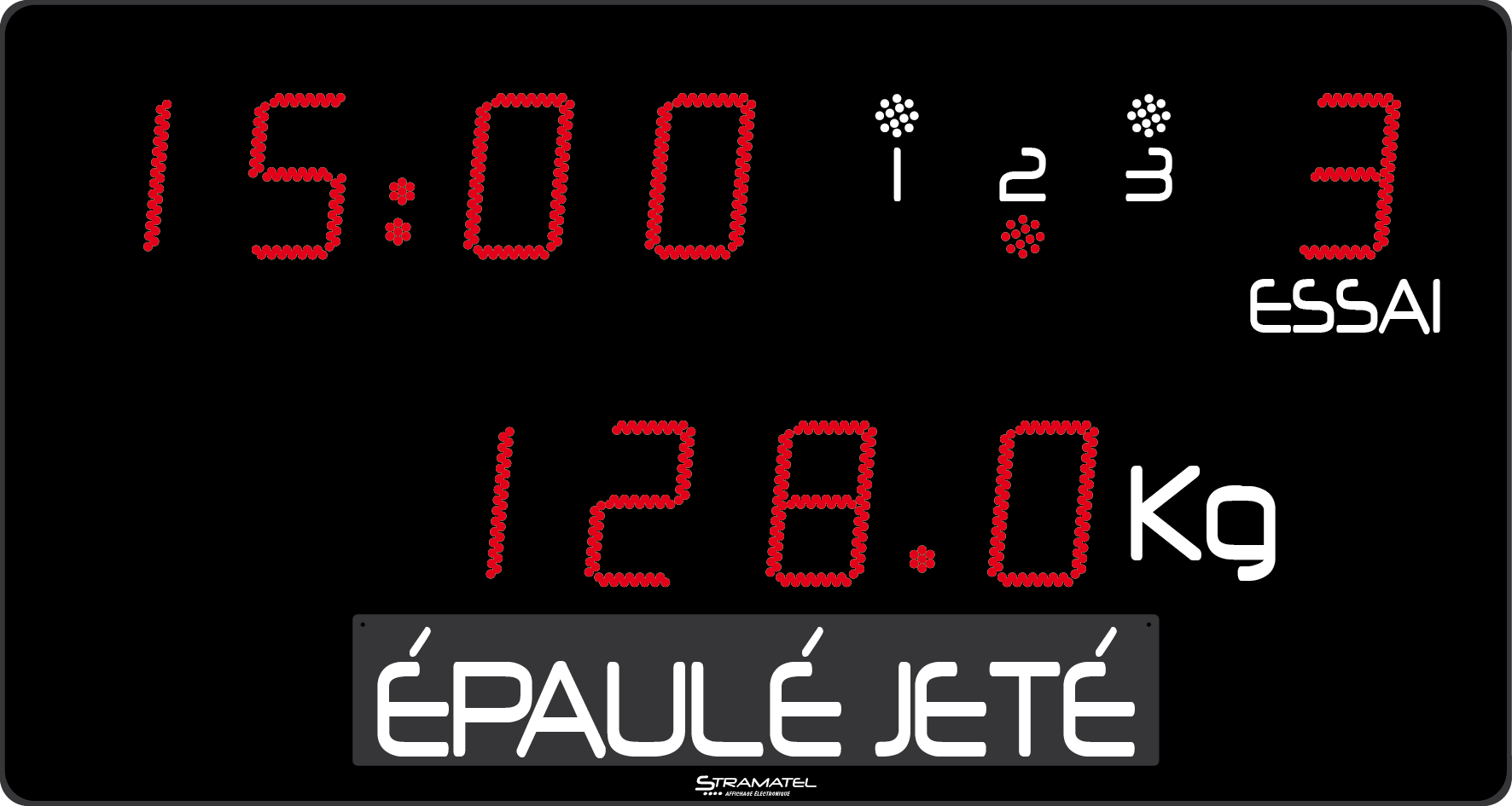 Le tableau d’affichage CHB de chez Stramatel est spécialement conçu pour l’haltérophilie. En voici sa description :