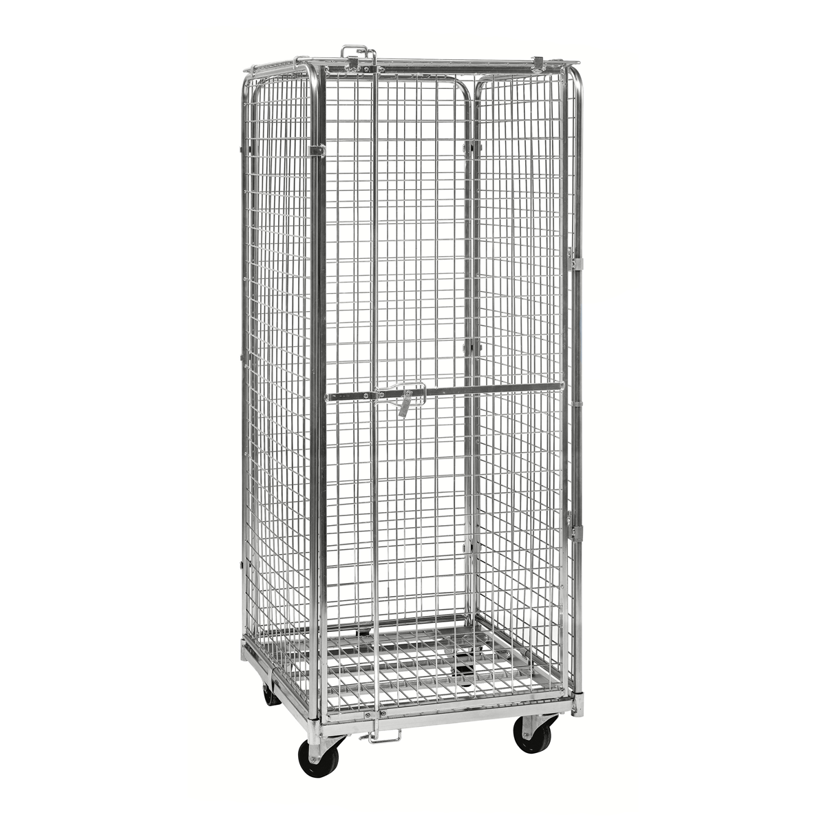 Armoire antivol en acier zingué équipée d’une porte conçue pour être fermée avec un cadenas (non fourni) et 4 roues de diamètre 100 mm (2 fixes + 2 pivotantes).