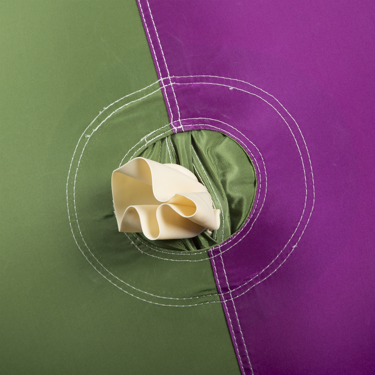 Sous la housse, une grande baudruche en latex donne à la balle sa forme sphérique; elle se gonfle et se dégonfle rapidement grâce à sa large ouverture.