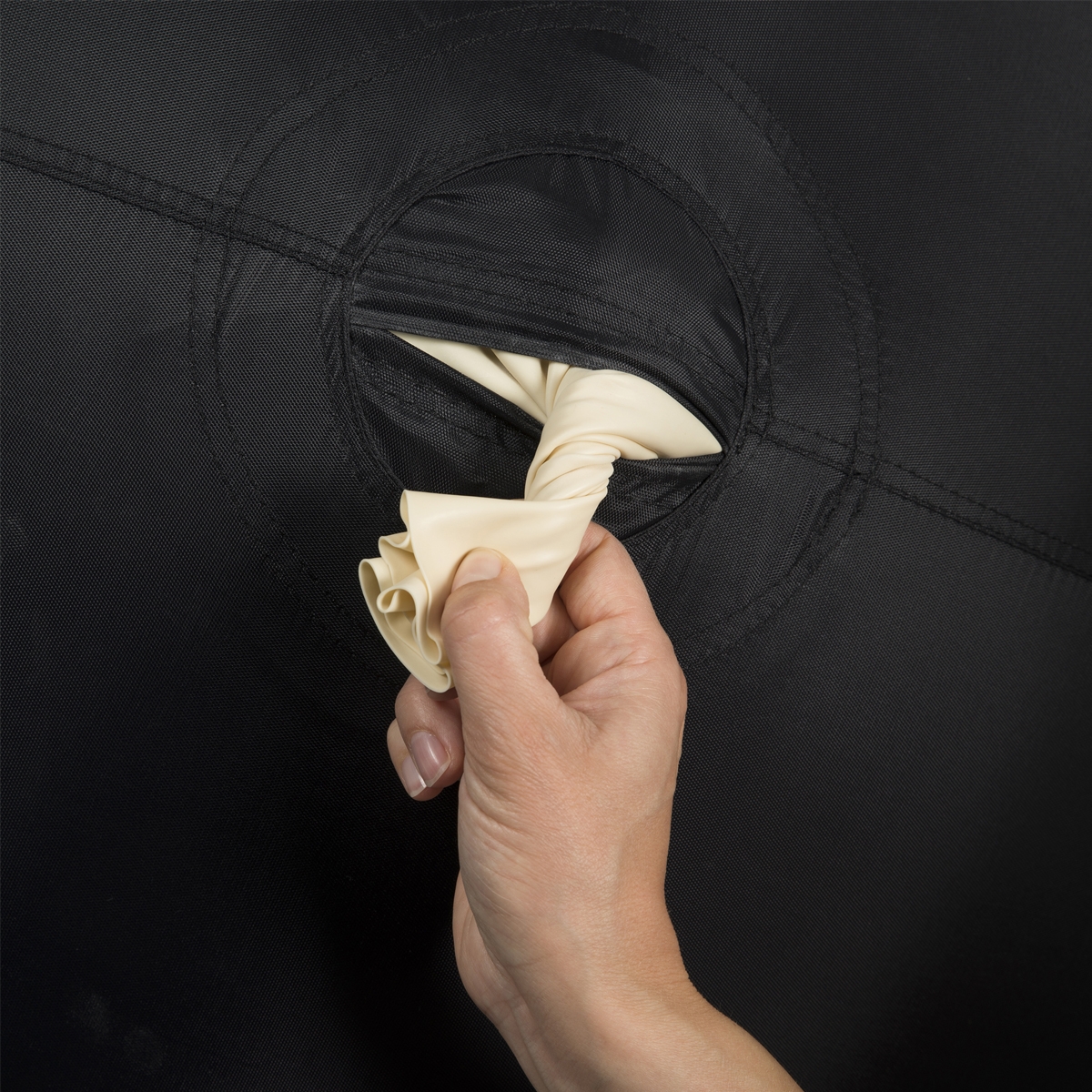 Sous la housse, une grande baudruche en latex donne à la balle sa forme sphérique; elle se gonfle et se dégonfle rapidement grâce à sa large ouverture.