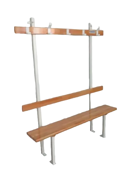 Banc vestiaire monolame en hêtre lamellé collé épisode 32mm, avec dossier et porte patères, vernis 2 couches.