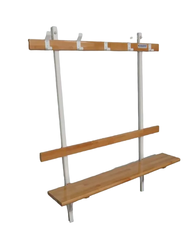 Banc vestiaire monolame en hêtre lamellé collé épaisseur 32mm, avec dossier et porte patères, vernis 2 couches.