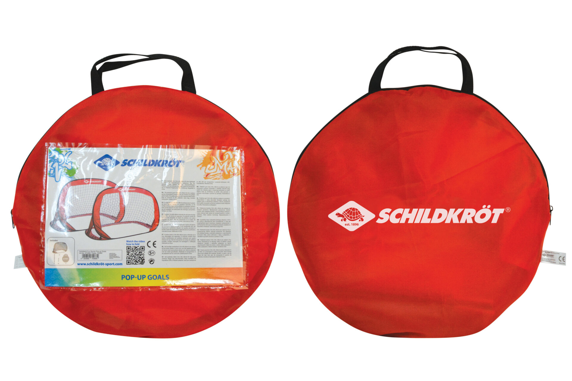 L’ensemble comprend deux buts pliables en polyester durable avec quatre crochets de sol en acier.