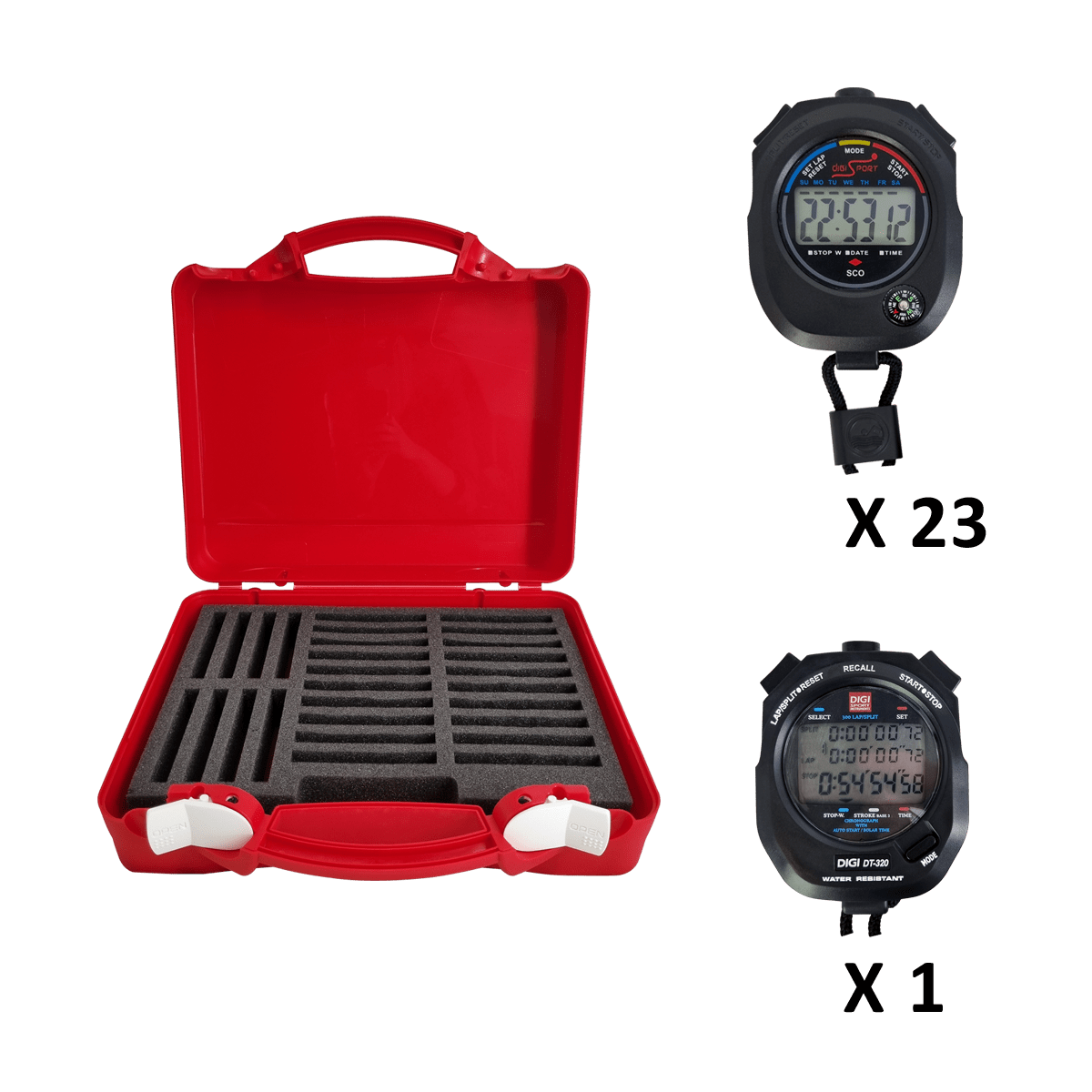 Mallette plastique rigide rouge certifiée DIGISPORT Instruments – Mousse compartimentée pour rangement et protection des produits – Dimensions : 330mm x 240mm x 80 mm – 23 chronomètres SCO – 1 chronomètre C300