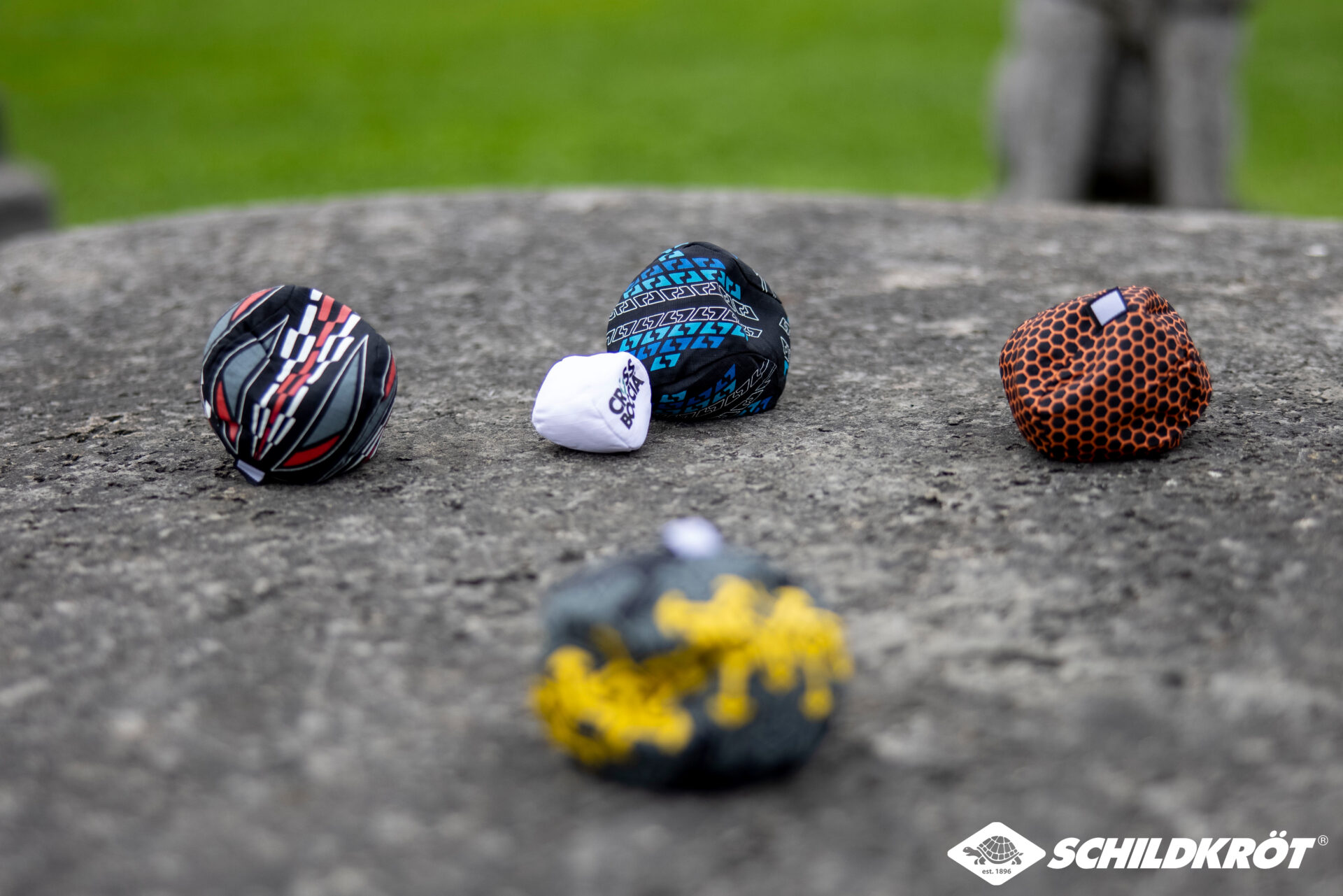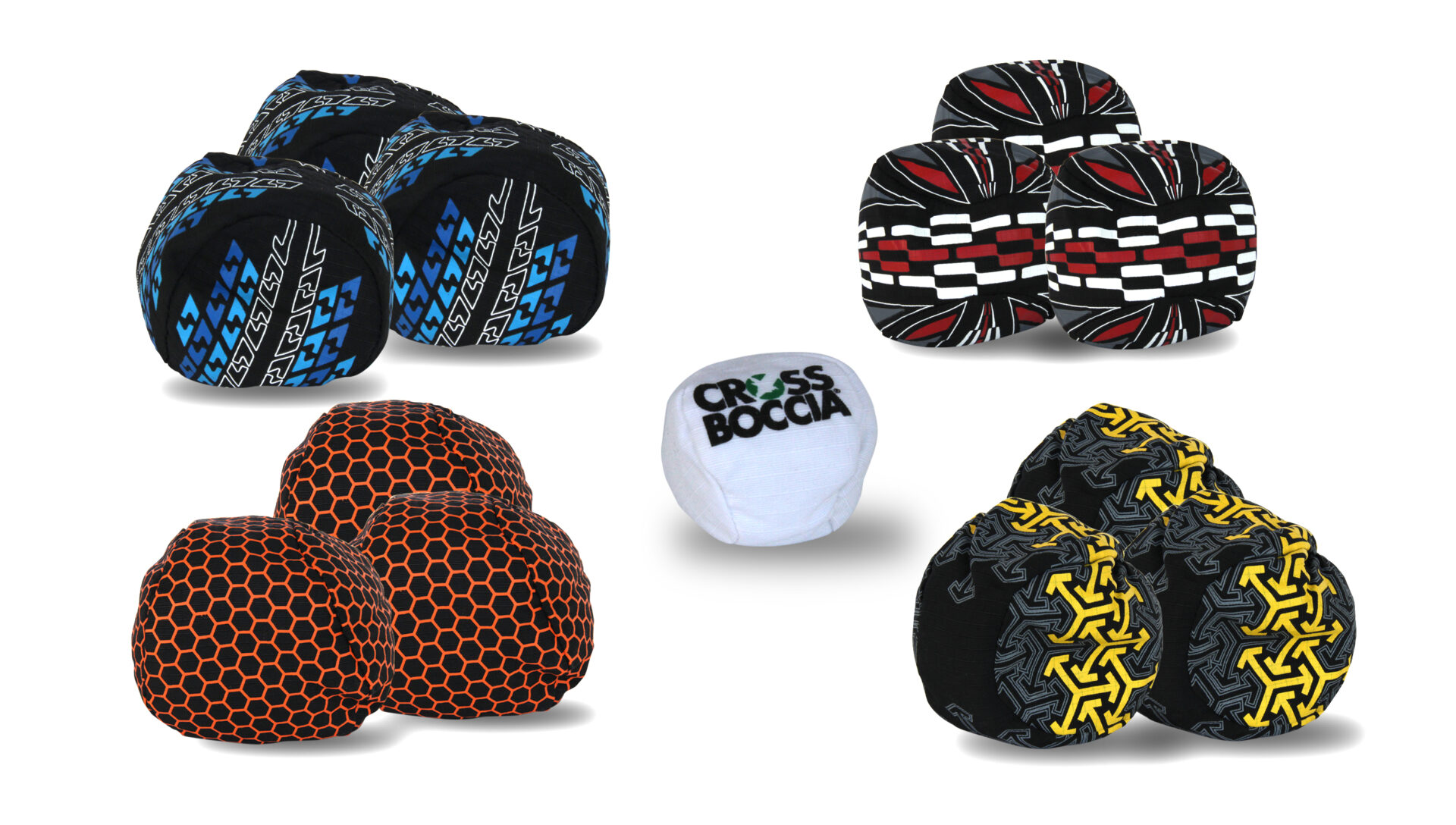 Contenu : 4 x 3 petits sacs en tissu de même couleur (Ø 8 cm), remplis de matière granulée (115 g par balle) avec étiquette nominative, 1 balle cible, le règlement officiel ainsi que l’approbation officielle pour les tournois.