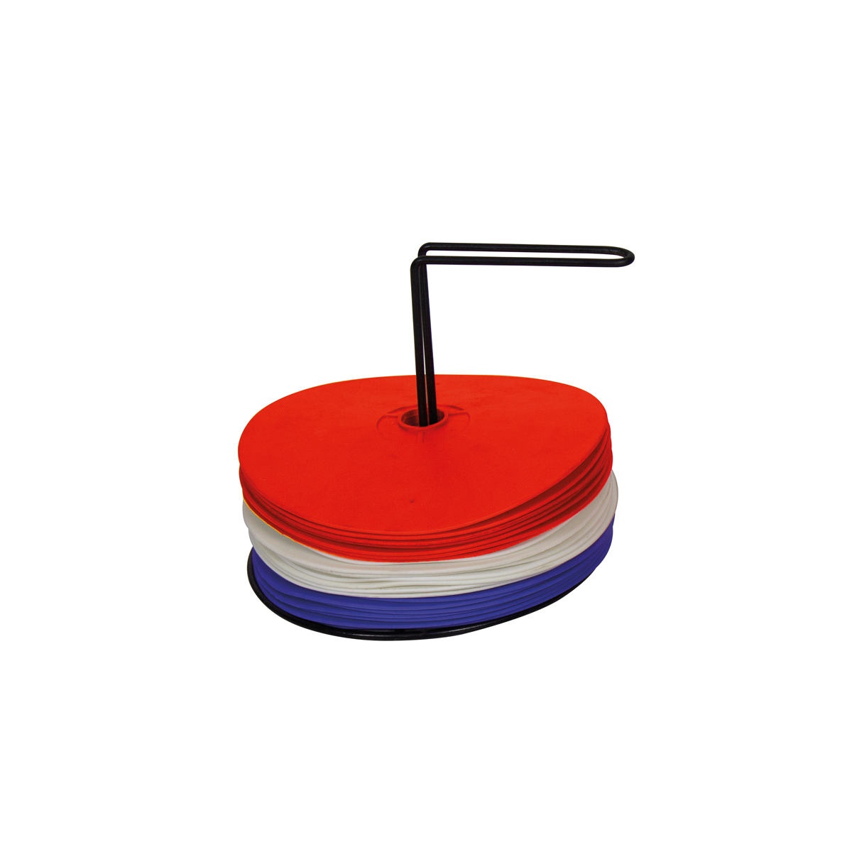Lot de 24 disques de repérage (8 bleus, 8 blancs et 8 rouges) antidérapants, parfaitement adaptés aux entraînements en salle ou sur terrain synthétique.