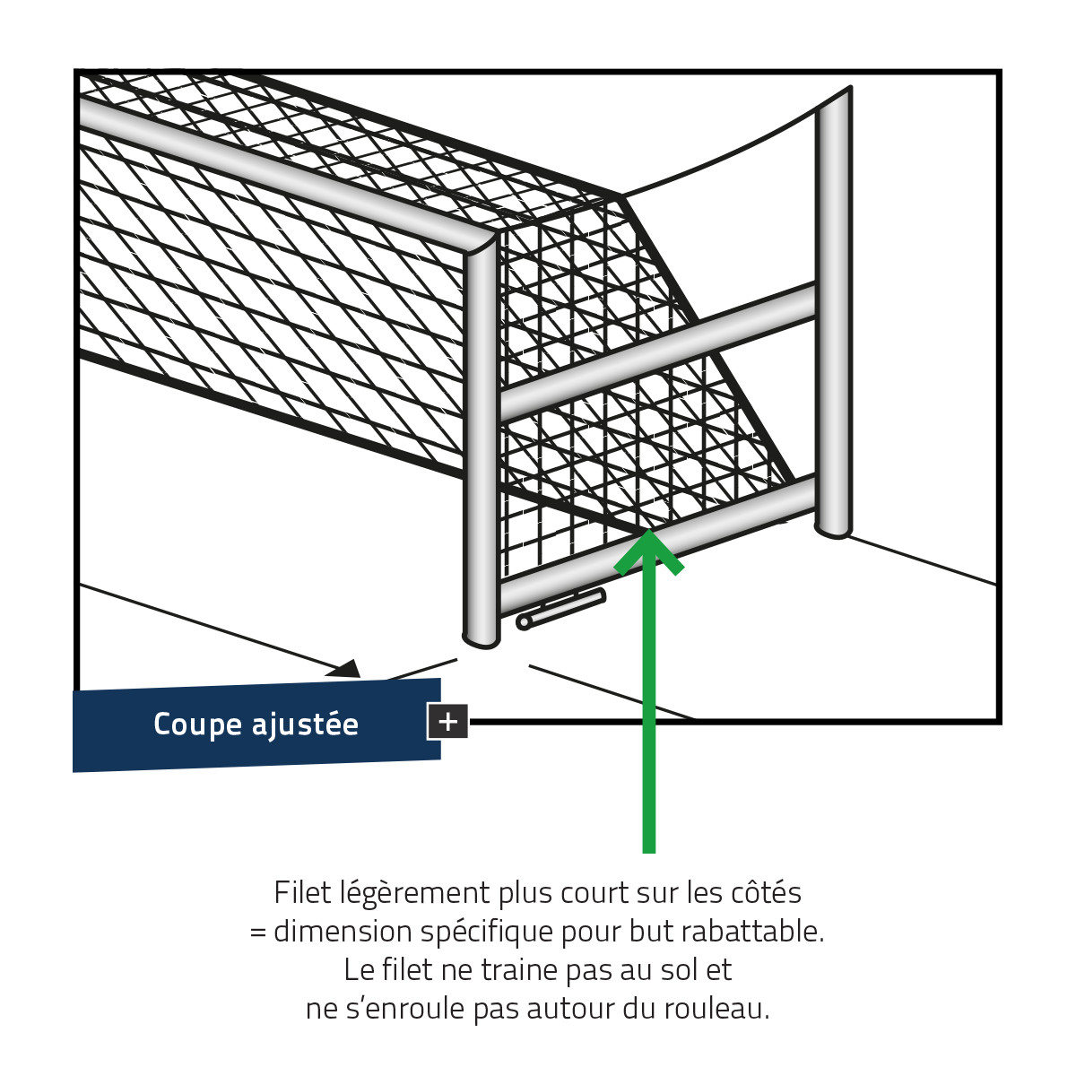 Filet pour but de football rabattable. Dimensions 6 x 2,10 x 0,60 x 1,60 m. Avec noeuds, PE tressé 2,5mm simple. Coloris noir. Coupe ajustée, filet légèrement plus court sur les côtés = dimension spécifique pour but rabbatable. Le filet ne traine pas au sol et ne s’enroule pas autour du rouleau.