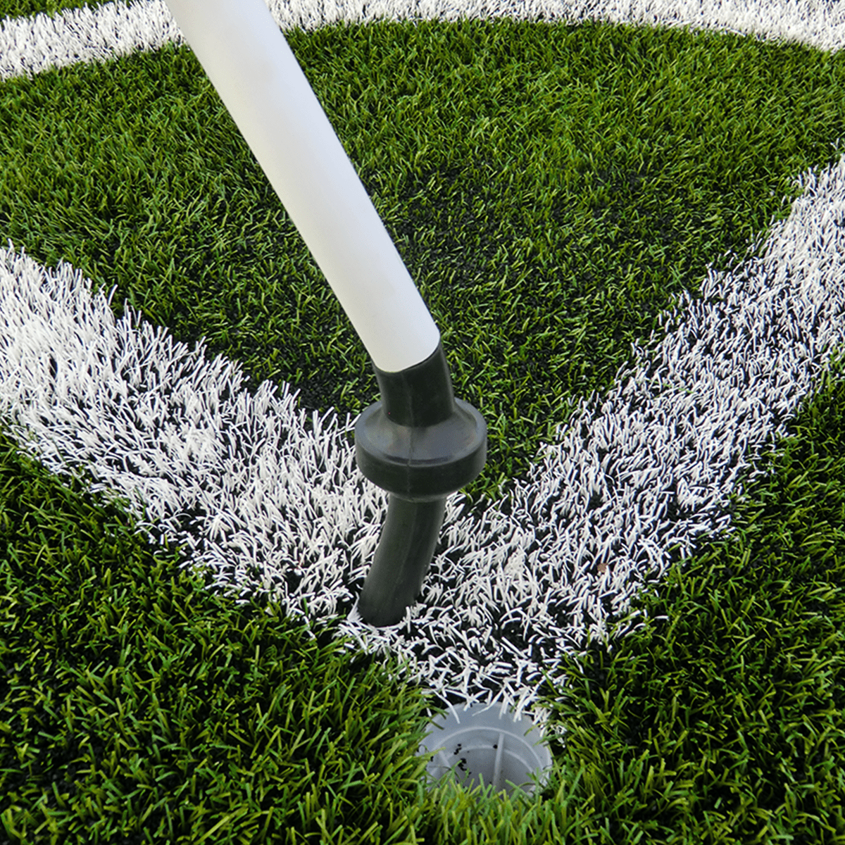 Poteaux réglementaires en tube PVC avec manchon noir articulé en caoutchouc + base support fixe à enfoncer dans le sol.