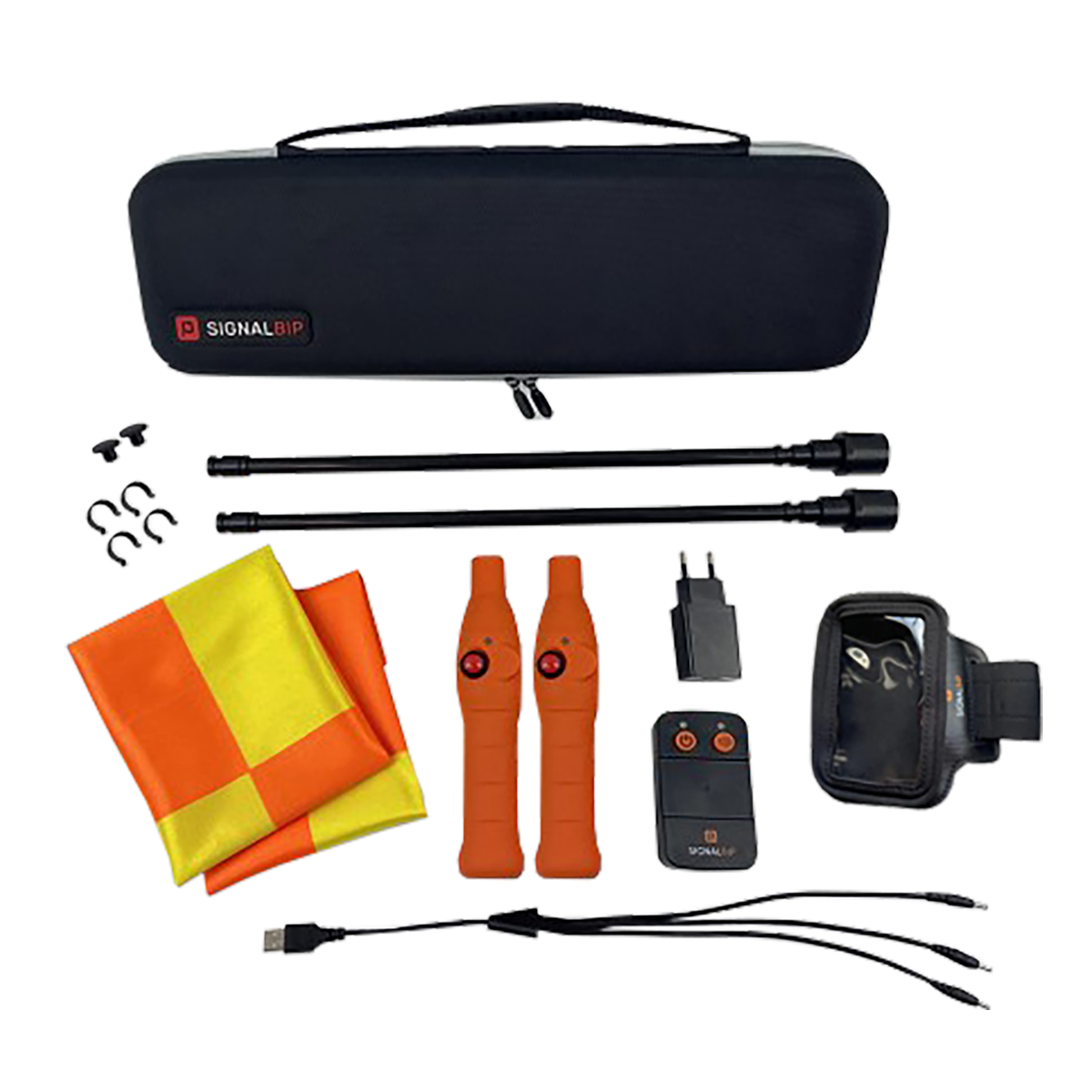 Chargeur fourni avec adaptateur USB de 3 connecteurs pour rechargement simultané des drapeaux et du boitier brassard.