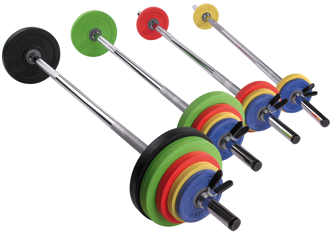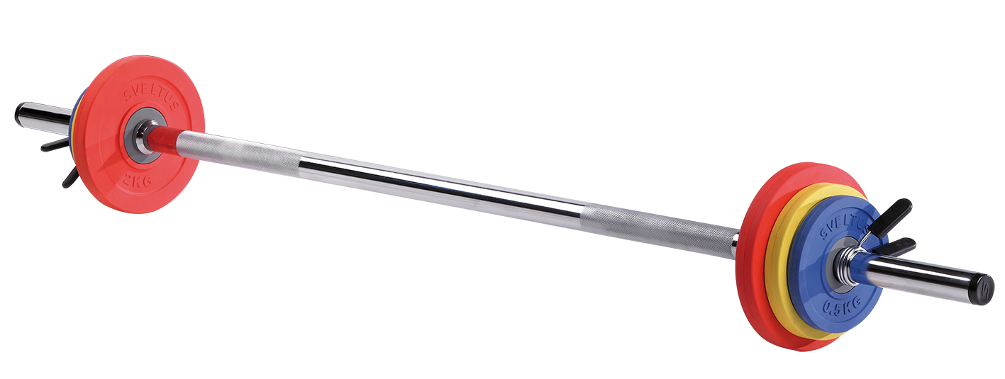 Disques + Barre acier chromée 130 cm/1 kg, Ø 28 mm + 1 paire de stop-disques (embouts plastifiés).