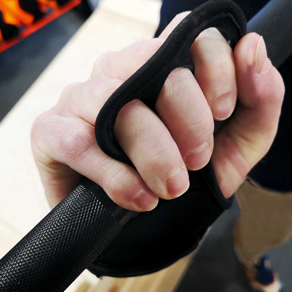 Réglage par sangle ajustable au niveau du poignet. Vous pouvez aussi ajouter de la magnésie sur la manique.