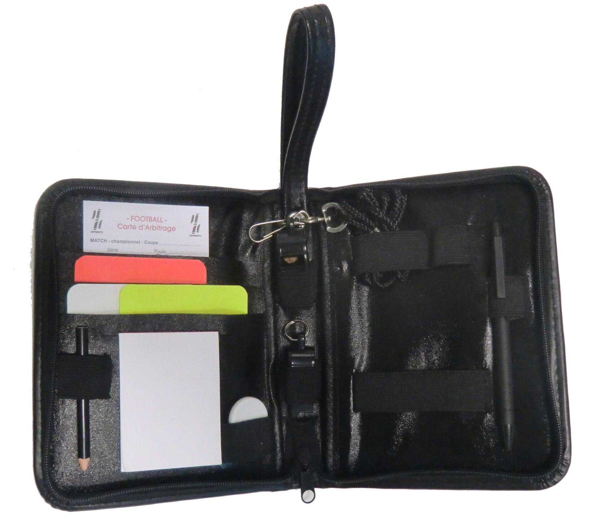 Ensemble comprenant 1 carton rouge, 1 carton jaune, 1 carton blanc, 1 carnet de 15 cartes arbitrage Foot, 1 bloc neutre, 1 sifflet avec cordon, 1 sifflet seul, 1 jeton à 2 faces, 1 crayon à papier et 1 stylo à bille ; le tout dans une sacoche avec plusieurs compartiments et une fermeture éclair.