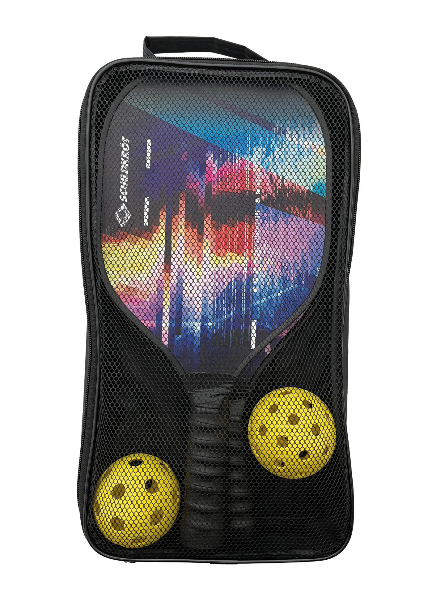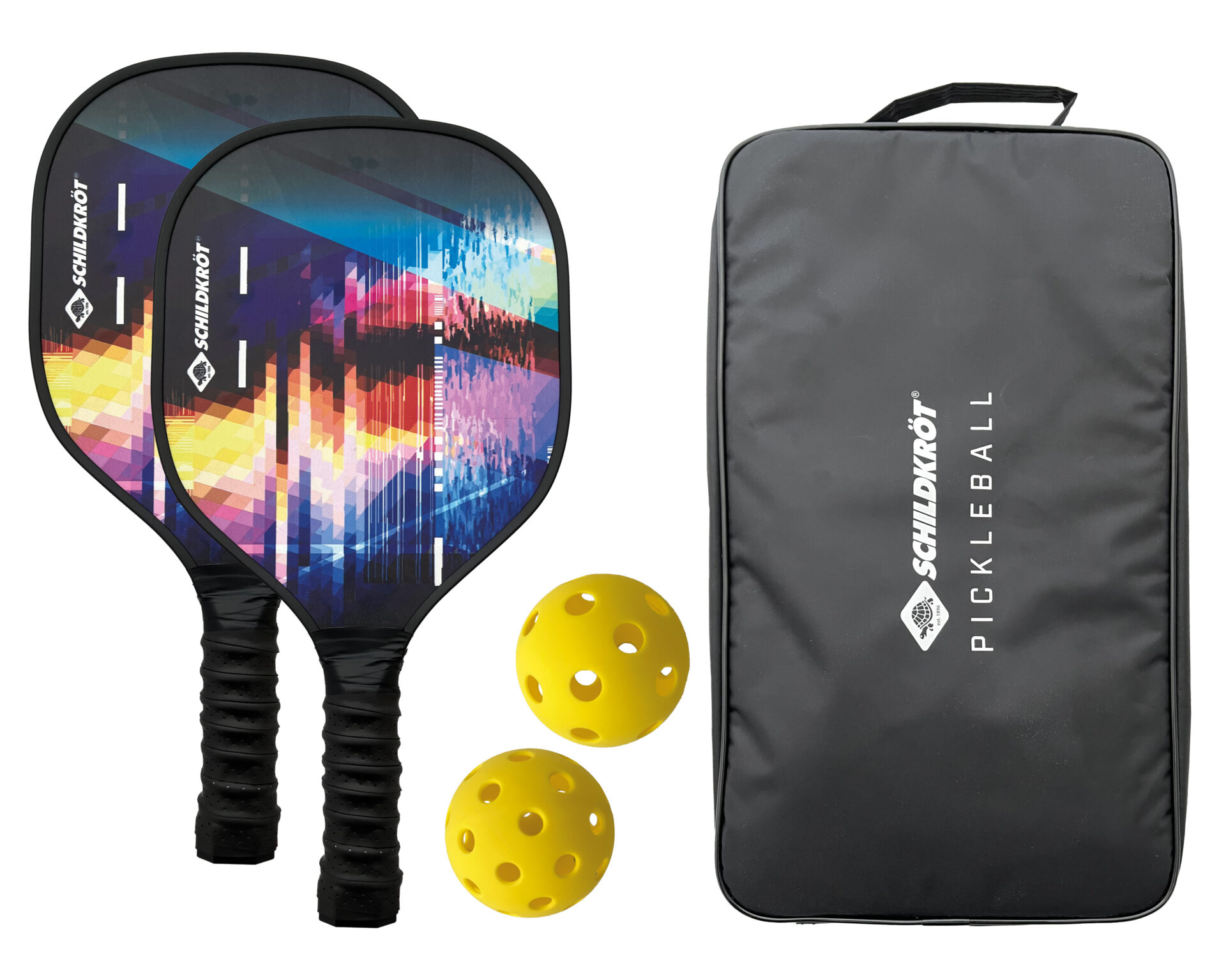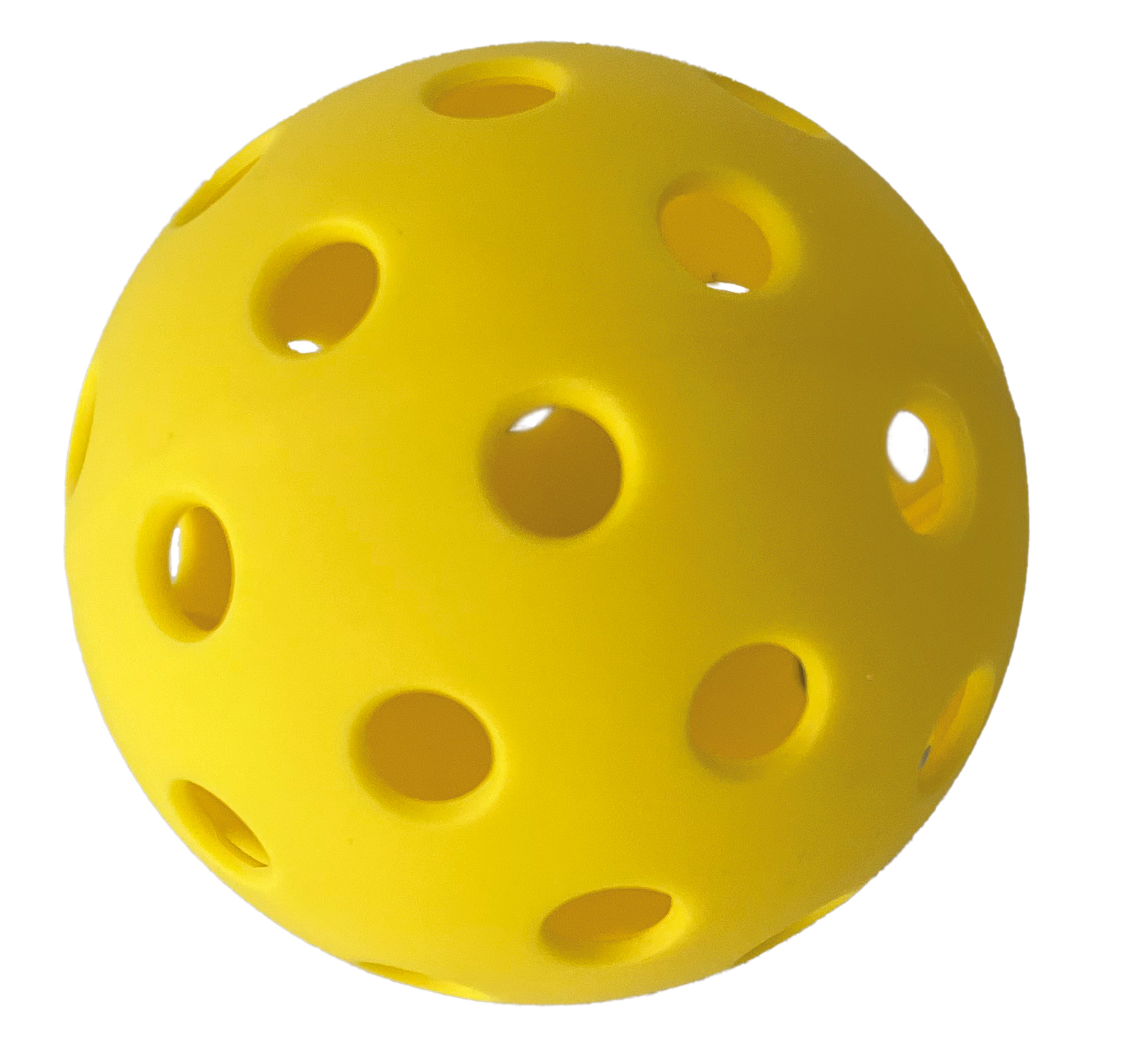 Le set de Pickleball se compose de 2 raquettes et de 2 balles à trous en TPE (1x intérieur avec 26 trous, 1x extérieur avec 40 trous/ Ø 72mm).
