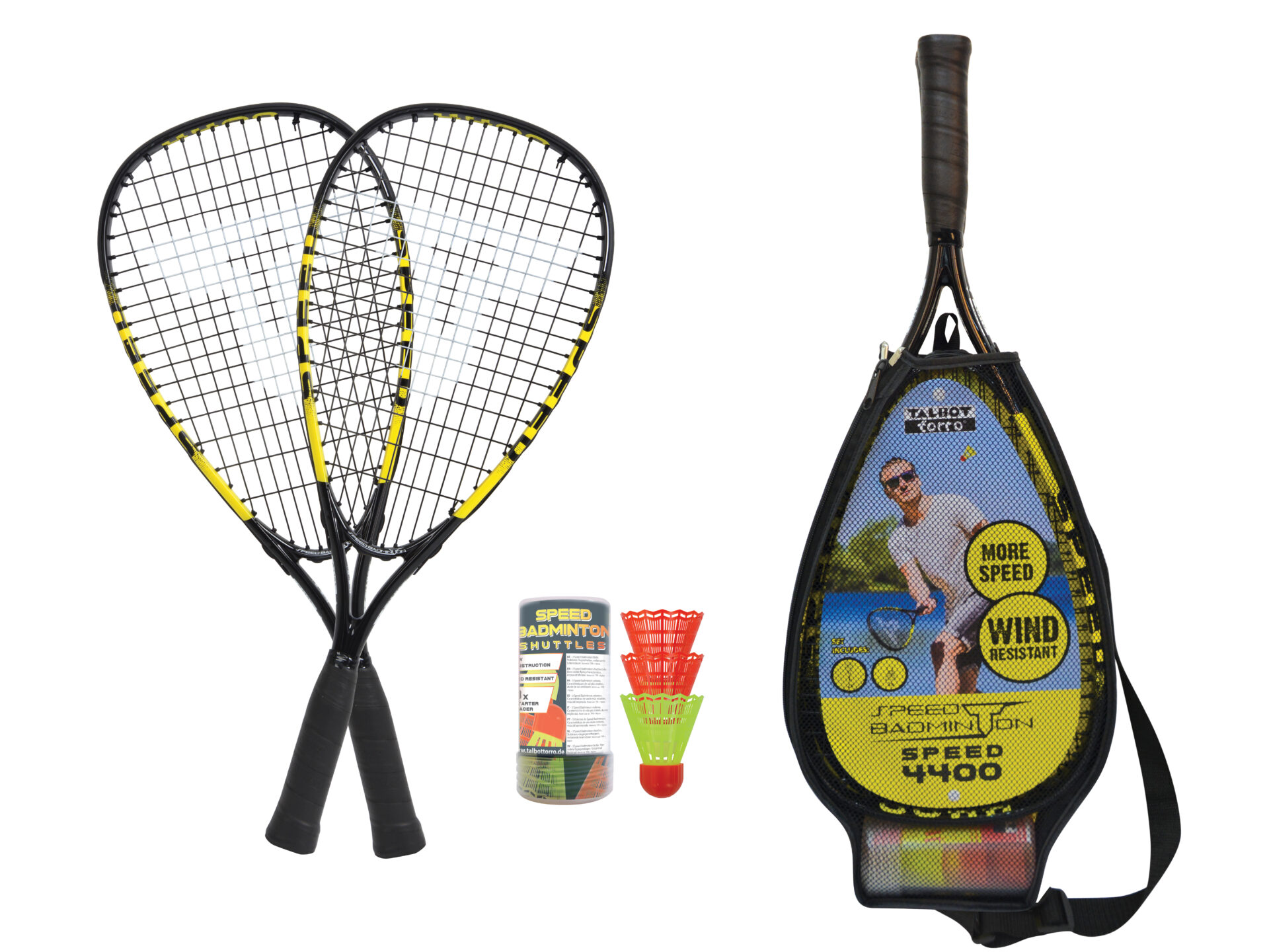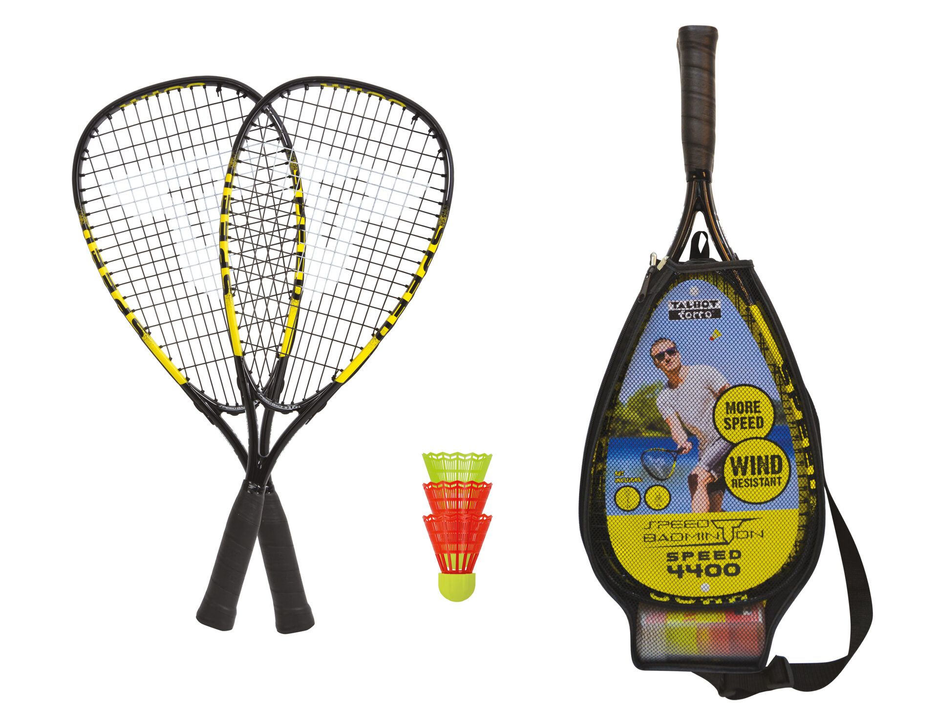 – 2 raquettes Speed 4400 (Aluminium léger trempé, 54,5cm de long, profil de cadre 17,3 mm, 165 g, cordage résistant) pour le joueur amateur de Speedbadminton,