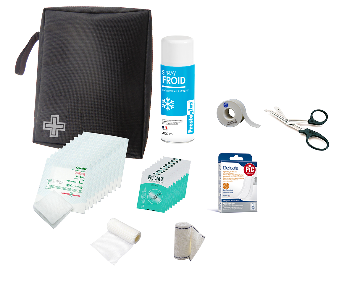 Composé d’un lot de 10 compresses stériles, 1 bombe de froid 400ml, 1 rouleau sparadrap, 1 bande de pansement à découper 6cmx50cm, 1 paire de ciseaux, 1 bande extensible, 1 bande de crêpe, 1 paire de gants de protection et 1 lot de 10 serviettes d’alcool à 70°.